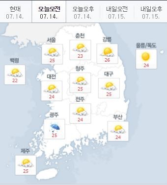 서울 25도, 춘천 23도, 대전 24도, 대구 25도, 광주 25도, 부산 24도, 제주 25도를 기록중이다.