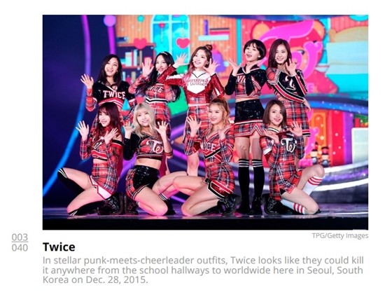 트와이스는 지난 2015년 12월 SBS 가요대전에서 입었던 의상으로 한국 걸그룹 중 최고 기록인 3위를 차지해 이목을 집중시켰다. 빌보드는 “화려하게 반짝이는 펑크 스타일의 치어리더 의상은 학교를 넘어서 전 세계도 장악할 수 있을 것만 같은 모습”이라고 트와이스의 스타일을 높이 평가했다.