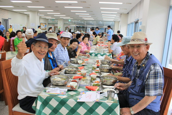 경기 오산남부종합사회복지관은 지난 12일 (주)교촌에프앤피의 후원을 받아 지역노인 200여명을 대상으로 ‘교촌에프앤비와 함께하는 복달임 행사’를 개최했다. 사진은 행사에 참석한 노인들이 삼계탕을 먹고 있는 모습.(사진제공=오산시청)