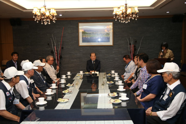 지난 13일 오후 박홍섭 서울 마포구청장(가운데)이 구청 지하 1층에 위치한 대화의방에서 열린 나눔사랑 공익바자회 수익금 후원 전달식에 참석해 감사의 말을 전하고 있다.(사진제공=마포구청)