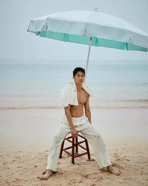 공개된 사진 속 그는 바다의 해변에서 화보를 촬영한 모습으로 남성적인 매력을 어필하고 있다.