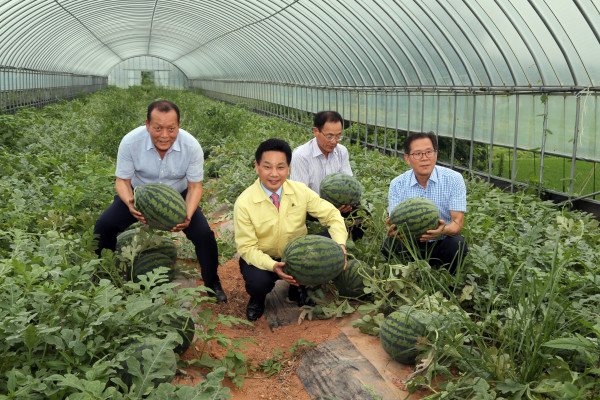| ▲ 산소농법 수박농가에 현장 방문한 전동평 군수(왼쪽 두번째)의 모습.(사진제공=영암군청) | ||
