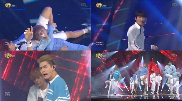 업텐션은 16일 ‘인기가요’에서 블루와 화이트가 겸비된 청량한 의상을 입고 무대에 올랐다. 이후 업텐션은 가창력은 물론, 화려한 무대매너로 여성 팬들의 환호성을 이끌어냈다.