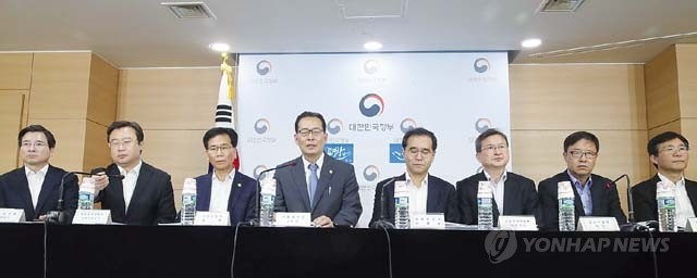 고형권 기획재정부 1차관(왼쪽에서 네 번째)이 16일 서울 세종로 정부서울청사 브리핑룸에서 관계부처 합동으로 ‘최저임금 인상에 따른 부담 완화를 위한 소상공인·영세중소기업 지원대책’을 발표하고 있다.
