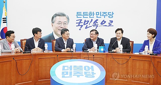 16일 오전 국회 더불어민주당 당대표회의실에서 열린 최저임금 대책관련 긴급 당정협의에서 김태년 정책위의장과 김동연 경제부총리 겸 기획재정부 장관이 이야기를 하고 있다. 왼쪽부터 정병헌 정무수석, 김상조 공정거래위원장, 김 부총리, 김 정책위의장, 홍익표 정책위수석부의장, 한정애 제5정책조정위원장.