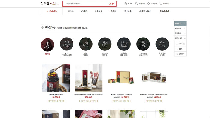 ‘정관장몰’은 총 2600여 제품이 입점돼 있으며 정관장 홍삼을 비롯한 건강기능식품이 전체의 40%인 1000여 제품, 화장품이 450여 제품, 안심먹거리가 300여 제품으로 구성돼 있어 건강 카테고리 킬러(건강기능식품에 특화된 온라인쇼핑몰) 형태이다.