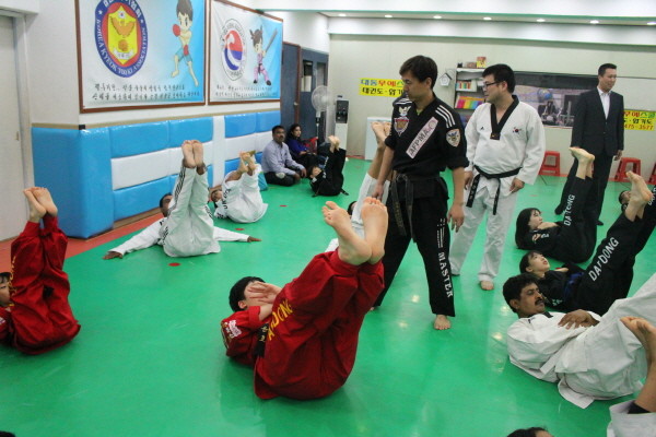 최근 사단법인 경찰아동청소년안전협회 서울 강동구지회가 강동구 천호동 대동무예스쿨에서 호랑기 태권도 아카데미팀과 부모를 초청해 학교폭력예방 안전교육과 호신술 교육을 병행하는 안전교육 프로그램을 실시했다. 사진은 교육 진행 모습.(사진제공=경찰아동청소년안전협회)