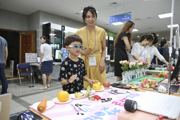 서울 성동구는 지난 14일 구청 3층에서 ‘어린이 프로그래밍 교육선생님 양성과정’ 수료생들의 작품전시회를 개최했다. 사진은 출품작 가운데 과일을 만지면 과일에서 소리가 나는 ‘아두이노보드를 이용한 인터랙티브 공작물’을 체험하고 있는 어린이의 모습.(사진제공=성동구청)