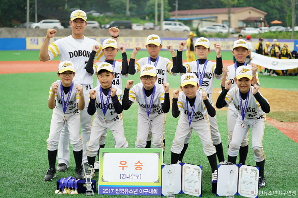 서울 도봉구유소년야구단은 최근 경기 연천군 고대산 야구장에서 열린 ‘2017 경기도 전국유소년야구대회’에 참여해 ‘꿈나무 리그’에서 우승을 차지했다. 사진은 야구단 단원들이 경기 종료 후 기념촬영을 하는 모습.(사진제공=도봉구청)