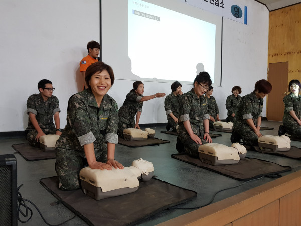 은평소방서는 최근 육군 219보병연대 예비군훈련장에서 은평 여성예비군을 대상으로 심폐소생술 교육을 실시했다. 사진은 여성예비군이 열심히 심폐소생술 실습을 하는 모습.(사진제공=은평소방서)
