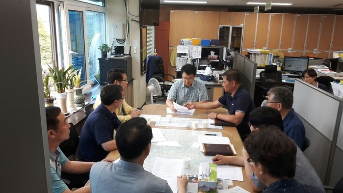 충남 아산시는 지난 15~16일 집중호우에 따라 피해상황 및 복구대책 수립을 위해 복기왕 아산시장 주재로 긴급 재난상황대책보고회를 열었다. 사진은 복 시장(가운데) 및 관계자들이 회의하는 모습.(사진제공=아산시청)