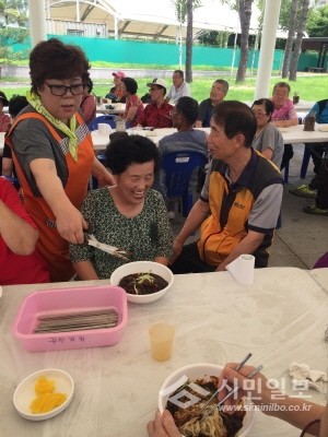 경기 양주시 회천2동 주민자치위원회는 최근 덕계공원에서 지역내 노인 200여명을 초대해 짜장면을 대접하는 '사랑의 짜장데이' 행사를 개최했다. 사진은 행사에 참여한 노인이 즐거워하는 모습.
