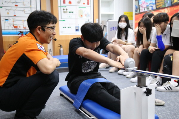 서울 강남소방서는 지난 17일 오후 세종고등학교(강남구 수서동 소재) 학생 30여명을 대상으로 '청소년 직업체험교실'을 운영했다. 사진은 학생들이 소방관이 되기 위한 체력 모의 테스트를 하는 모습.(사진제공=강남소방서)
