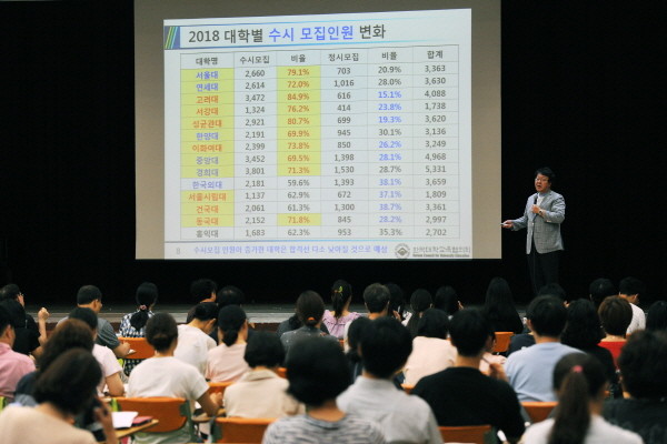 지난 15일 서울 동대문구는 고등학생과 학부모를 대상으로 '2018학년도 대입 수시지원 전략 설명회'를 개최했다. 사진은 한국대학교육협의회 대입상담센터 대표강사가 수시 모집인원 변화에 대해 설명하는 모습.(사진제공=동대문구청)