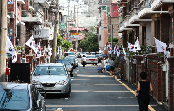 서울 송파구의 잠실본동 주민들이 제69회 제헌절(17일)을 기념해 집집마다 태극기를 게양했다. 사진은 잠실본동 주택가 골목의 집집마다 나란히 태극기가 게양돼 있는 모습.(사진제공=송파구청)