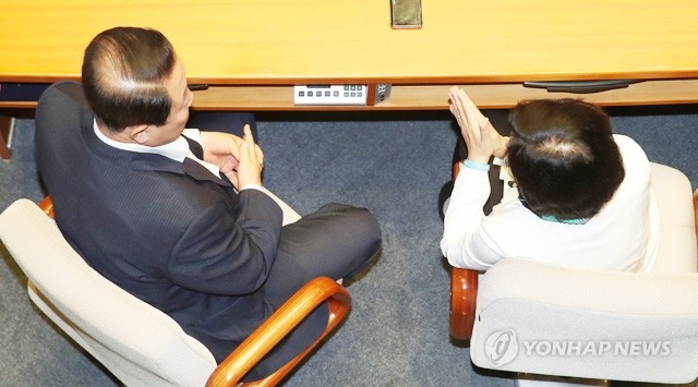 18일 오후 국회에서 열린 본회의에서 더불어민주당 추미애 대표(오른쪽)가 국민의당 박주선 비대위원장과 이야기를 하고 있다.
