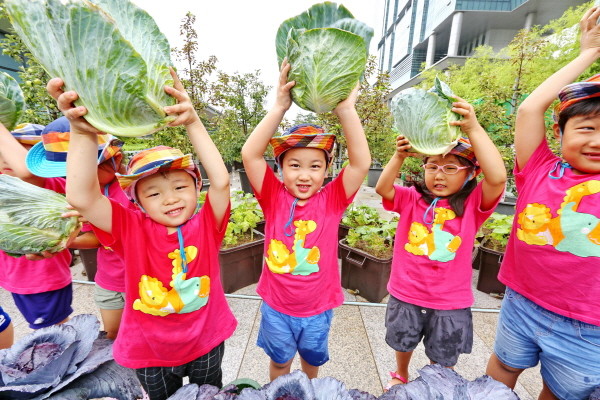 서울 금천구는 지난 18일 오전 10시 구청 옥상텃밭에서 지역내 어린이집 아이들 60여명이 참여하는 양배추 수확 체험행사를 개최했다. 사진은 어린이들이 수확한 양배추를 들고 즐거워하는 모습.(사진제공=금천구청)