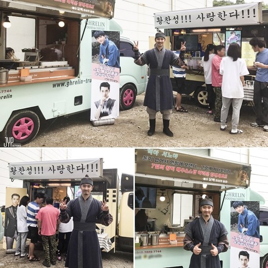 사진 속에는 황찬성이 커피차와 분식차 앞에서 환한 미소를 지으며 다양한 포즈를 취하고 있다.