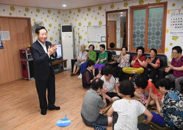 이용주 서울 영등포구의장은 지난 18일 오후 2시 양평동 경로당에서 열린 '2017년도 상반기 양평2동 노인대학 방학식'에 참석했다. 사진은 방학식에 참석한 이 의장이 경로당을 찾은 노인들을 격려하는 모습.