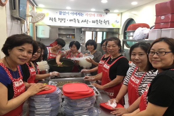 경기 수원시 권선구 평동 통장협의회는 지난 18일 통장 10여명이 참여한 가운데 저소득층 및 홀몸노인 49가구를 위한 사랑의 119 반찬 나눔을 진행했다. 사진은 참여자들이 반찬을 만들면서 기념촬영을 하는 모습.(사진제공=권선구청)