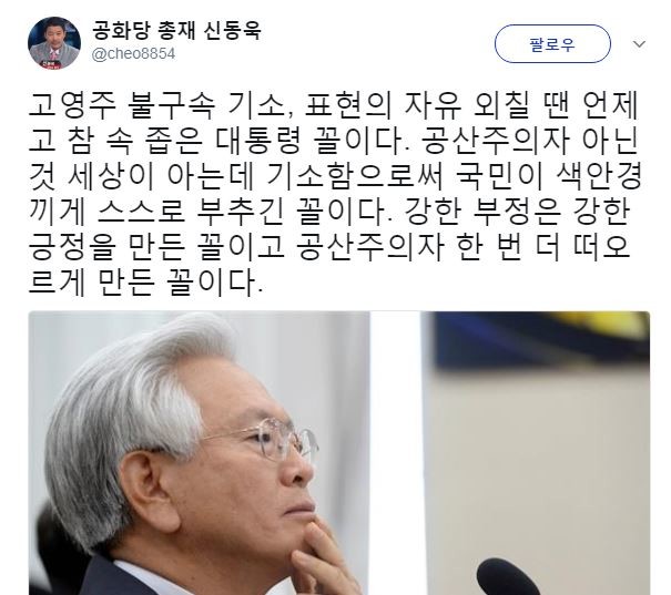 이날 공화당 신동욱 총재는 자신의 트위터에 "고영주 불구속 기소, 표현의 자유 외칠 땐 언제고 참 속 좁은 대통령 꼴이다. 공산주의자 아닌 것 세상이 아는데 기소함으로써 국민이 색안경 끼게 스스로 부추긴 꼴이다. 강한 부정은 강한 긍정을 만든 꼴이고 공산주의자 한 번 더 떠오르게 만든 꼴이다"라는 글을 공개해 이목을 집중시켰다.