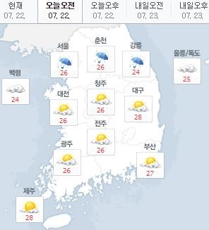 오전 서울은 26도, 춘천 26도, 대전 26도, 청주 26도, 전주 26도, 부산 27도, 제주 28도를 기록 중이다.