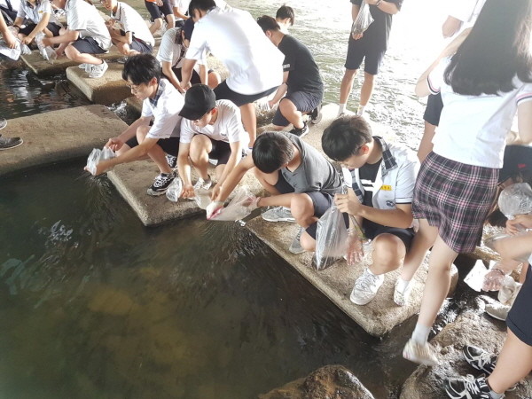 지난 20일 서울 서초구 양재천에서 은성중학교 학생 등 430여명이 함께 친환경 모기 방제 효과가 있는 미꾸라지 30Kg을 하천에 방류하고 쓰레기를 줍는 하천 정비 체험 행사를 펼쳤다. 사진은 미꾸라지를 방류하고 있는 어린이들의 모습.(사진제공=서초구청)
