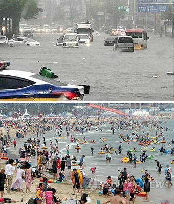 서울과 인천(강화·옹진 제외)을 비롯해 경기도 일부 등 모두 12개 시군에 호우경보가 발효된 23일 오전 인천 남구 간석동 도로 일부가 침수돼 차들이 힘겹게 통과하고 있지만(위), 남부지방에는 폭염특보가 이어져 부산 해운대 해수욕장을 찾은 피서객들이 물놀이를 즐기고 있다.