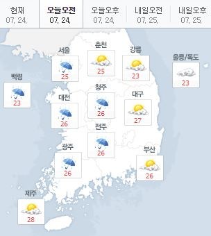 서울 오전 25도, 춘천 25도, 대전 26도, 청주 26도, 대구 27도, 부산 26도, 제주 28도를 기록 중이다.