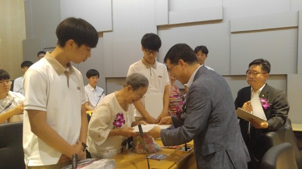 최근 종로구 교남동 주민센터 주관으로 ‘간호사·의사를 꿈꾸는 청소년들과 홀몸 어르신 1:1 결연맺기’ 행사가 열렸다. 사진은 강북삼성병원 신관 15층 세미나실에서 열린 결연식에서 노인이 결연증서를 전달받고 있는 모습.(사진제공=종로구청)