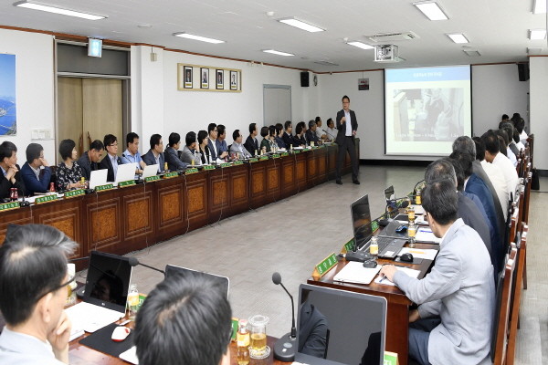 서울 광진구가 최근 구청 기획상황실에서 간부직원 57명을 대상으로 ‘제4차 산업혁명과 스마트시티 이해’ 특강을 실시했다. 사진은 황종성 한국정보화진흥원 연구위원이 강의를 진행 중인 모습.(사진제공=광진구청)