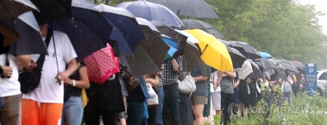 인천시 송도국제도시 송도 6, 8공구 R1블록에 공급하는 주거용 오피스텔 ‘힐스테이트 송도 더테라스’의 송도국제도시 견본주택에 24일 오후 장맛비가 내리는 가운데 방문객들이 길게 줄을 서고 있다.
