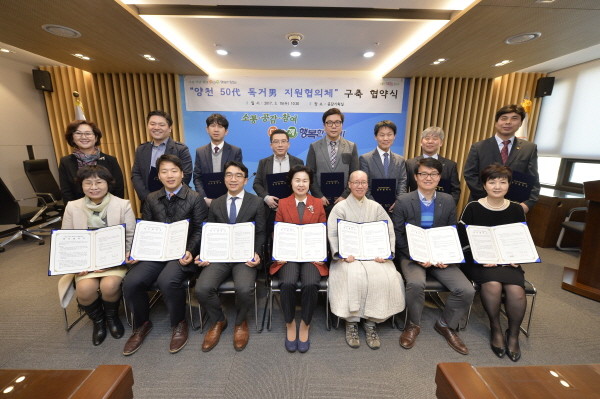 | ▲ 50대 독거남 지원협의체 협약식에 참석한 김수영 구청장(앞줄 가운데)이 협약서를 들고 기념촬영을 하고 있다. | ||