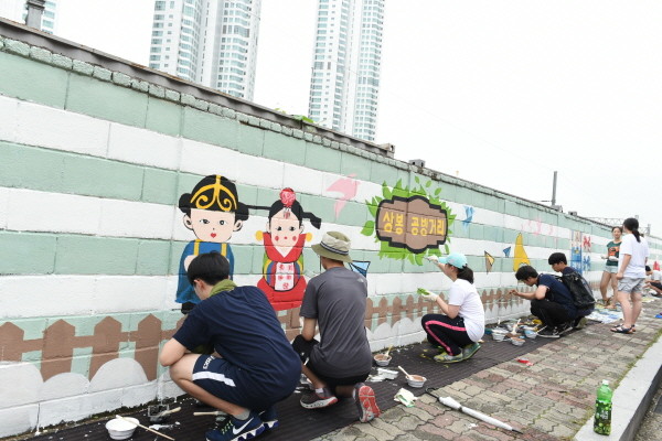 중랑구는 지난 24일 약 180m에 달하는 망우역의 낡은 담장을 테마가 있는 벽화거리로 조성했다. 사진은 벽화전문봉사단체 네오맨 관계자 및 봉사자들이 벽화 그리기 작업을 진행 중인 모습.(사진제공=중랑구청)