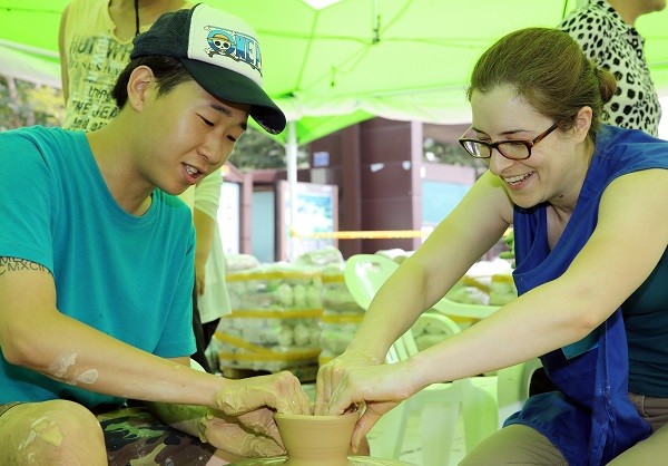 | ▲ 사진은 지난해 청자축제장을 찾은 외국 여성 관광객이 직접 물레체험을 하며 즐거워 하고 있는 모습 | ||