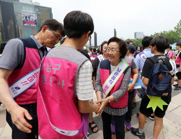 | ▲ 신연희 구청장이 자원봉사에 참여한 청년과 인사를 나누고 있다. | ||