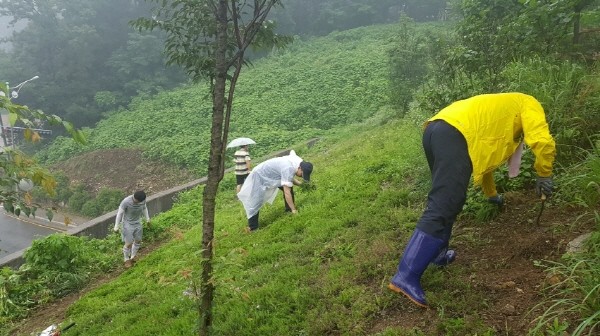 경기 동두천시 생연1동 주민자치위원회는 최근 주민자치위원과 자원봉사 학생 등 20여명이 참석한 가운데 깨끗한 마을길 가꾸기 행사를 실시했다. 사진은 참여자들이 못골 터널 위에 조성된 꽃 잔디밭에서 잡초를 제거하는 모습.(사진제공=동두천시청)
