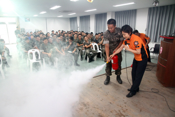은평소방서는 지난 24일 팬텀부대를 찾아가 군 장병 200여명을 대상으로 화재예방 소방안전교육을 실시했다. 사진은 군인들이 소방관에게 소화기 사용 방법에 대해 배우는 모습.(사진제공=은평소방서)