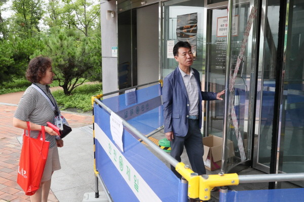| ▲ 박문수 강북구의장이 북서울꿈의숲 전망대 출입구 유리 파손사고 현장을 찾아 파손된 출입구를 살펴보고 있다. | ||