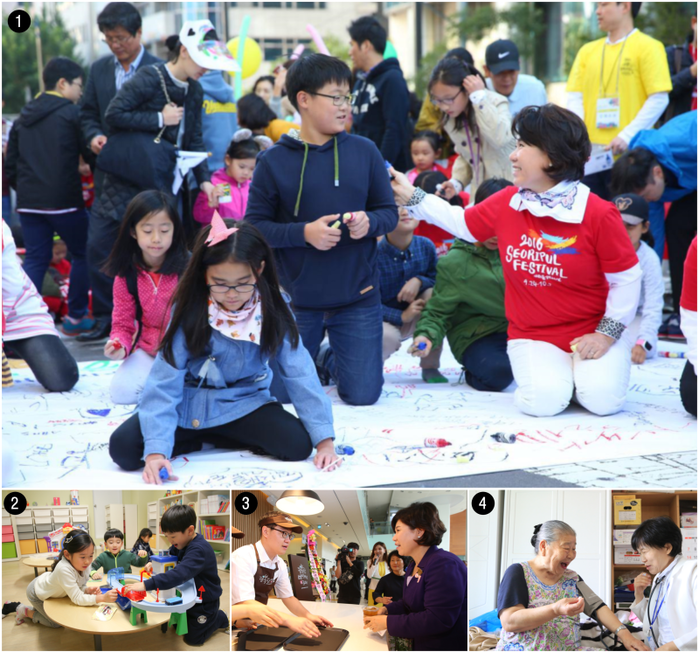 | ▲ 1. 서초구의 대표적인 문화축제인 '서리풀 페스티벌'의 일환으로 열린 지상최대 스케치북 행사에 참석한 조은희 구청장이 행사를 즐기고 있는 아이들과 함께 시간을 보내고 있다. 2. 반포 반딧불센터에서 놀고있는 아이들. 3. 발달 장애인들을 위한 정책의 일환으로 진행된 '행복한 베이커리 카페'를 방문한 조 구청장이 카페 직원과 이야기를 나누고 있다. 4. 서초구는 노인들을 위해 다양한 효도정책을 펼치고 있다. 사진은 효도간호사가 한 노인의 혈압을 재며 이야기를 나누고 있는 모습. |