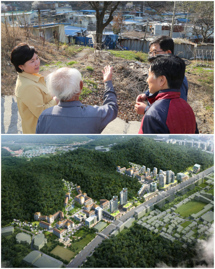 | ▲ 위: 성뒤마을 현장을 방문한 조은희 구청장(왼쪽)이 주민·관계자들과 함께 이야기를 나누고 있다. 아래: 성뒤마을 조감도 |