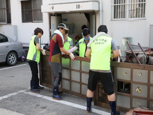 의원들은 가장 큰 피해를 입은 신천동 일대 수해현장에서 침수피해를 입은 가구 운반 및 세척 등 공동주택 안팎의 청소를 하고 피해 주민들을 위로했다.