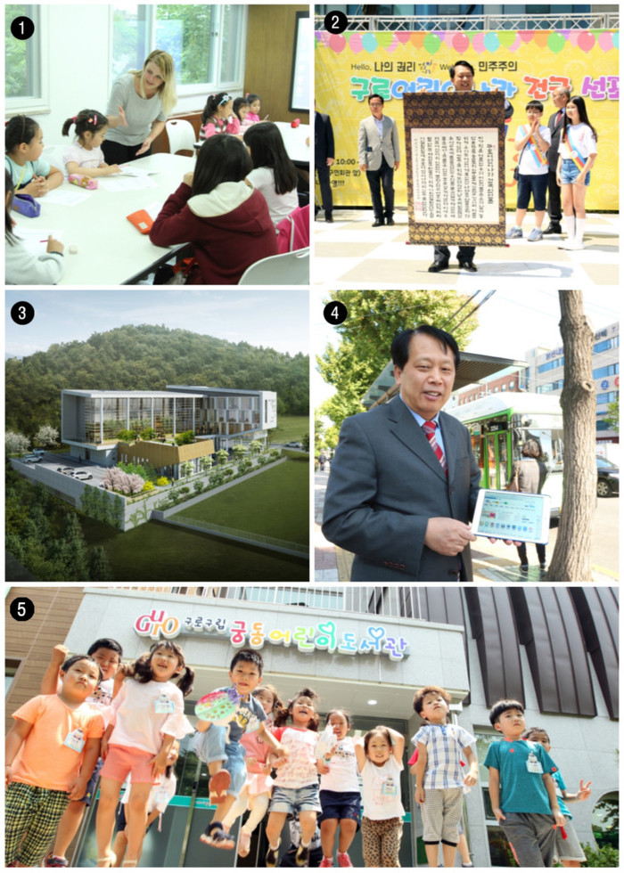 | ▲ 1. 구로학습지원센터에서 외국인 원어민 선생님과 함께 영어수업을 하고있는 아이들2. 구로어린이나라 건국 선포식에 참여한 이성 구청장이 '구로어린이나라건국선언문'을 들고있다.3. 서남권50+ 캠퍼스 조감도4. 버스정류장에서 와이파이를 사용한 태블릿 이용법을 시연하는 이성 구청장5. 유아자료실, 어린이·청소년 자료실, 옥외체험장 등으로 구성된 연면적 660㎡, 지상 3층 규모의 '궁동어린이도서관' | ||