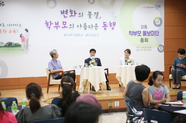 이해식 서울 강동구청장은 지난 26일 오전 구청 대강당에서 '강동 학부모 돌보미단 총회'를 개최하고 ‘진심토크’를 열었다. 사진은 이 구청장(가운데)이 발언하는 모습.(사진제공=강동구청)