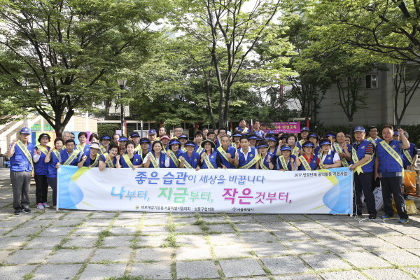 바르게살기운동 서울 성동협의회가 지난 26일 주민들의 질서의식 함양과 자발적 구정참여를 유도하자는 취지에서 ‘법질서 확립을 위한 기초질서 지키기 캠페인’을 실시했다. 사진은 협의회 회원들이 캠페인 후 기념촬영을 하는 모습.(사진제공=성동구청)