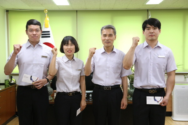 서울 강남소방서는 27일 오전 현장활동 우수대원 격려와 사기 진작을 위한 격려식을 진행했다. 사진은 김시철 서장(오른쪽 두 번째)과 우수대원으로 선정된 소방관들이 기념촬영을 하는 모습.(사진=강남소방서)