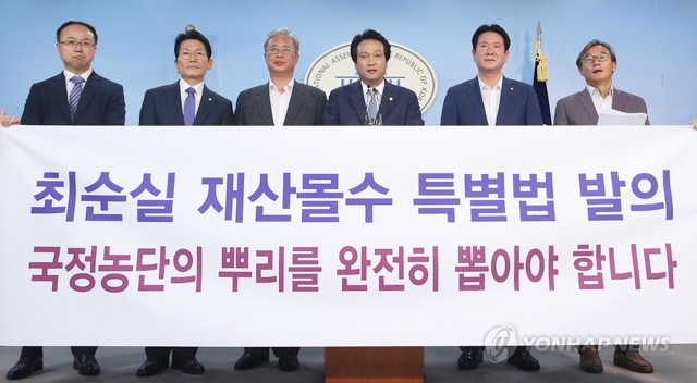 27일 오전 국회 정론관에서 더불어민주당 안민석 의원을 비롯한 의원들이 최순실 재산몰수 특별법 발의 기자회견을 하고 있다. 왼쪽 둘째부터 법무법인 이래 박현석 변호사, 정의당 윤소하 의원, 국민의당 유성엽 의원, 더불어민주당 안민석 의원, 국민의당 이동섭 의원, 더불어민주당 전재수 의원.