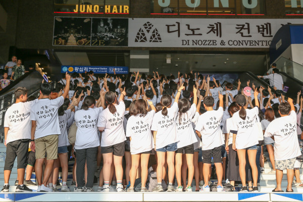 서울 성동구는 지난 26일 오후 왕십리광장에서 정원오 구청장과 지역내 중·고등학생 200여명이 참석한 가운데 소녀상 건립에 대한 긍정적 분위기 확산을 위한 플래시몹 행사를 개최했다. 사진은 플래시몹을 끝낸 후 기념촬영을 하는 모습.(사진제공=성동구청)