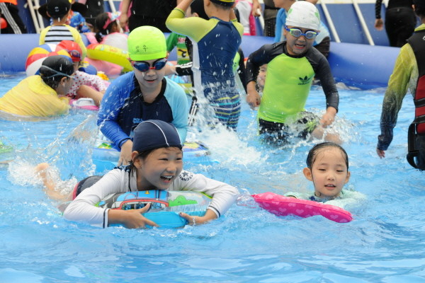 지난 27일 중랑구 망우 초등학교에 이동식 물놀이장이 설치돼 어린이들이 물놀이를 하고 있다. 구는 오는 8월27일까지 지역내 4개 초등학교와 2개 공원을 찾아가는 이동식 물놀이장을 운영한다.(사진제공=중랑구청)