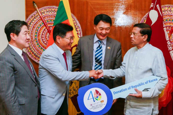 [시민일보=이진원 기자]자유한국당 홍문종 의원(외교통일위원회·왼쪽 두번째)이 29일 마이트리팔라 시리세나(Maithripala Sirisena) 스리랑카 대통령을 만나 한국산 급수차 8대를 전달하고 있다. 이 자리에는 같은 당 유기준 의원과 장원삼 주 스리랑카 대사, 한국국제협력단 관계자들이 함께 했다.